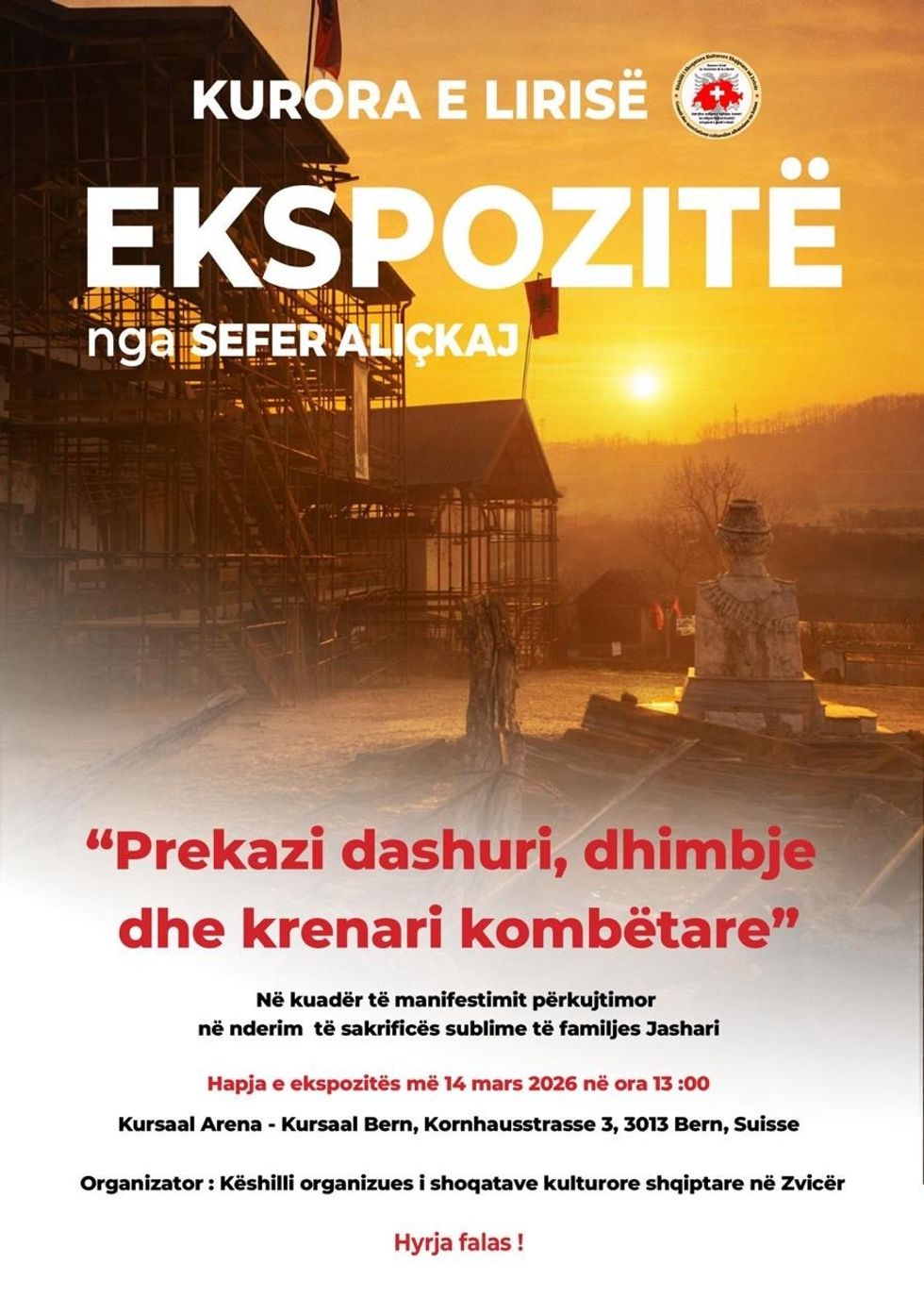 Ekspozita, e cila organizohet nga Këshilli Organizues i Shoqatave Kulturore Shqiptare në Zvicër, synon të përcjellë përmes artit historinë, qëndresën dhe emocionet që lidhen me Epopenë e UÇK-së dhe sakrificën që ndryshoi rrjedhën e historisë së Kosovës. Ekspozita hapet më 14 mars në orën 13:00, në “Kursaal Arena – Kursaal Bern”, teksa hyrja do të jetë falas.