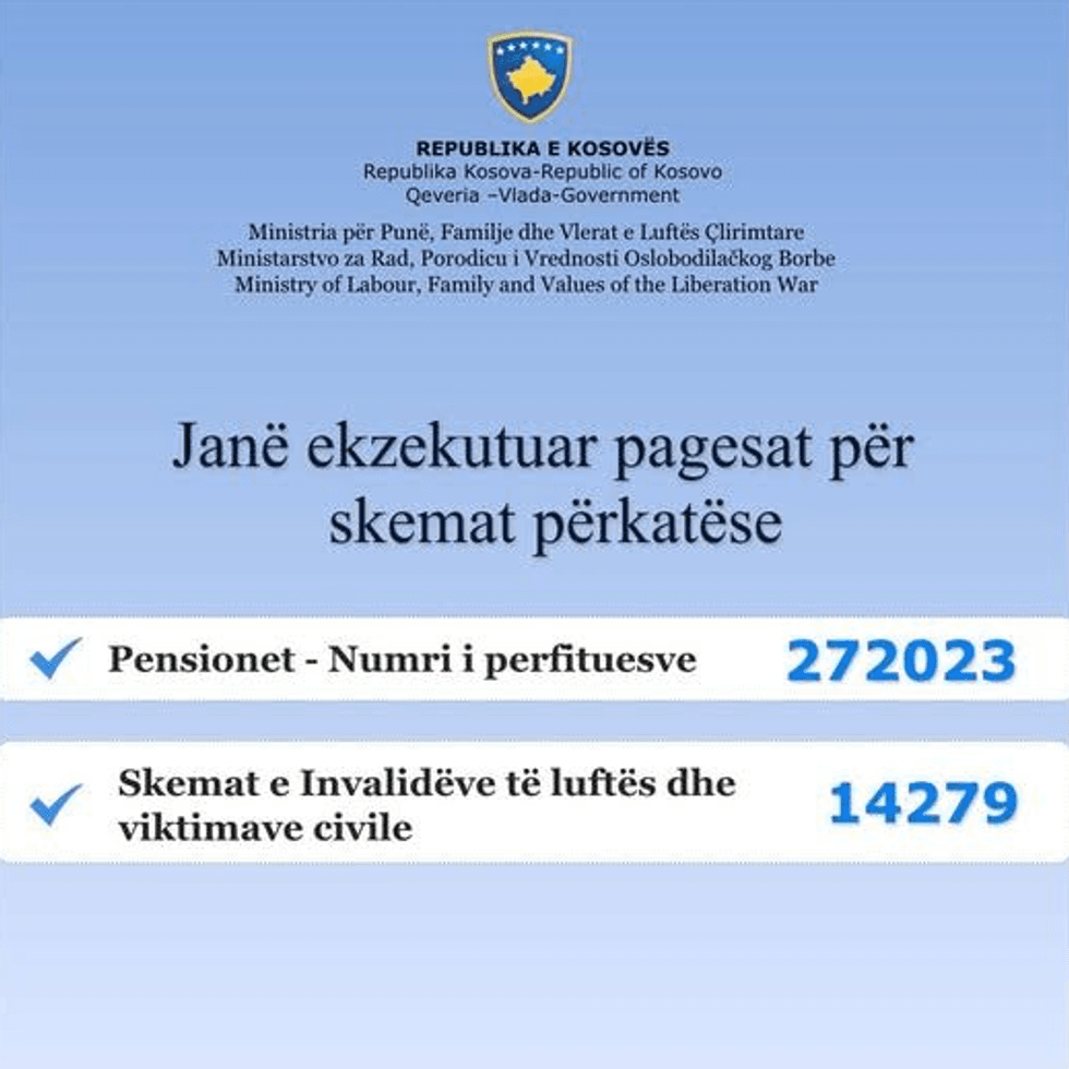 Po ashtu, janë alokuar edhe pensionet për skemat e invalidëve të luftës dhe viktimat civile, ku përfshihen gjithsej 14,279 përfitues.