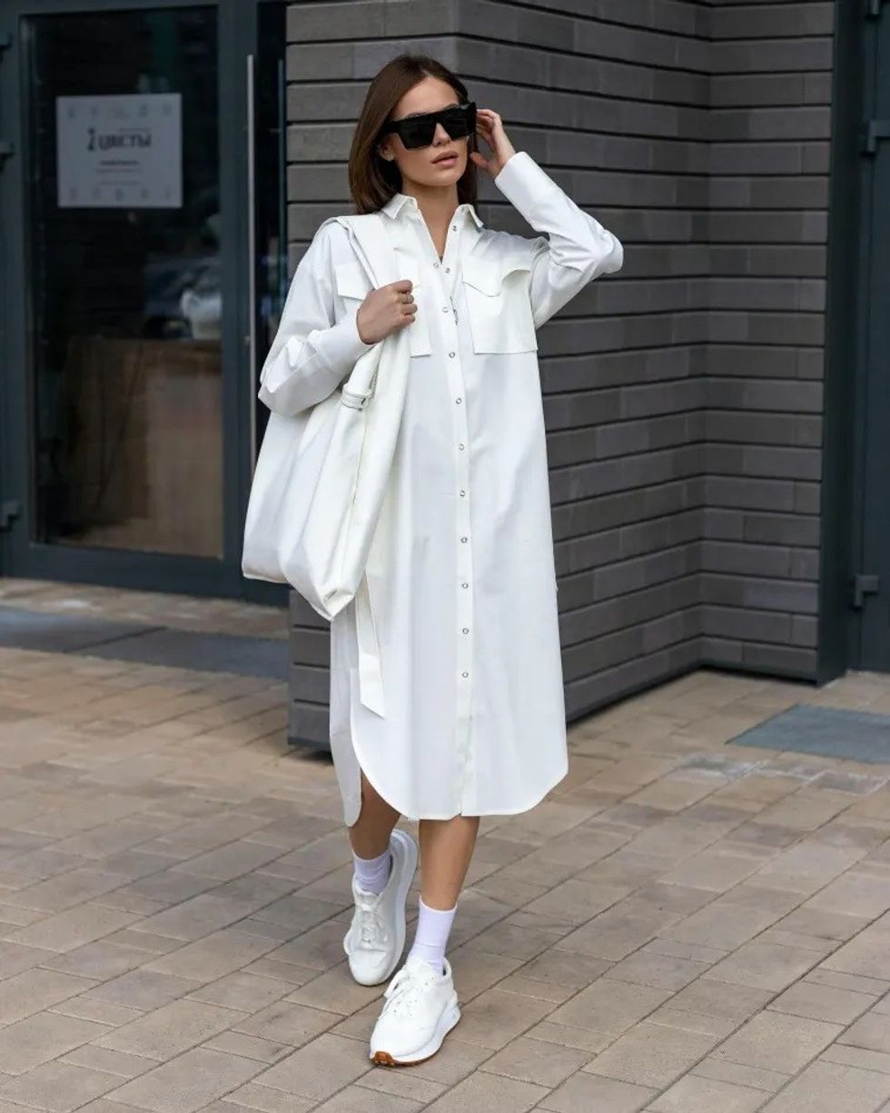 Nëse motoja juaj e modës është “më pak është më shumë”, këmishë-fustani është pëlhura ideale. Pamja minimalistike mbështetet në prerje të pastra, strukturë të lehtë dhe nuanca pa kohë që kurrë nuk dalin nga moda. Këmishë-fustani i bardhë, bezhë ose gri e hapur me prerje precize transmeton menjëherë sofistikim të qetë dhe pa pretendime. Kërkoni detaje si jakë e definuar, mëngë me kapëse apo kapëse të fshehta, që përmirësojnë prerjen duke ruajtur pamjen e pastër.