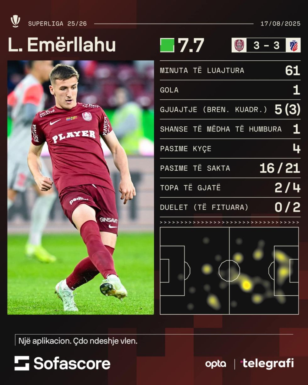 Në anën tjetër, Lindon Emërllahu u vlerësua me notën 7.7, për 61 minuta sa luajti, duke arritur 76 për qind të pasimeve të sakta.
