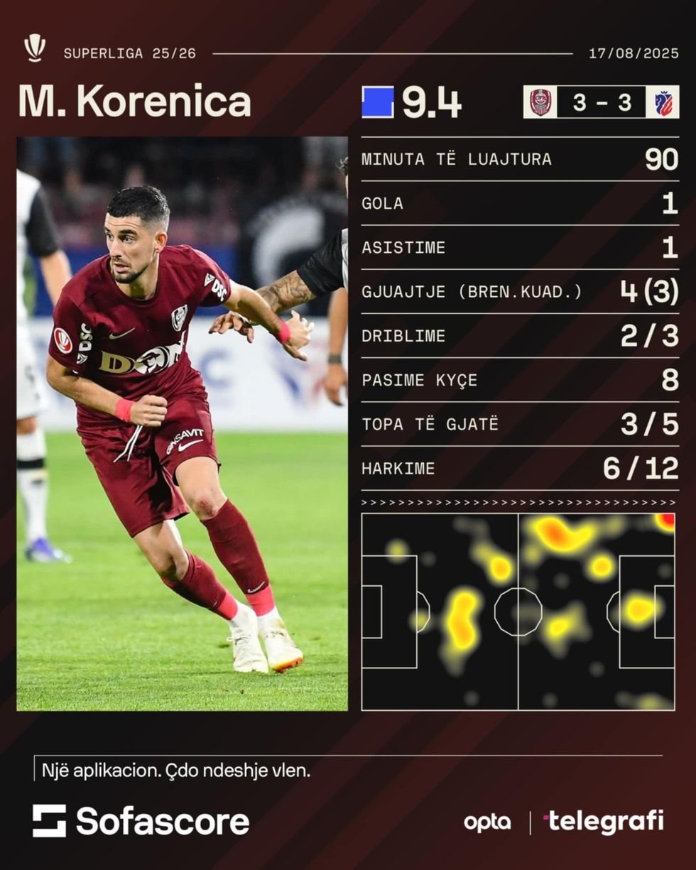 Meriton Korenica u vlerësua nga SofaScore me notën 9.4, pas golit dhe asistimit, ndërsa kishte edhe tetë pasime kyçe, tre goditje në portë dhe 6 pasime të gjata të sakta.