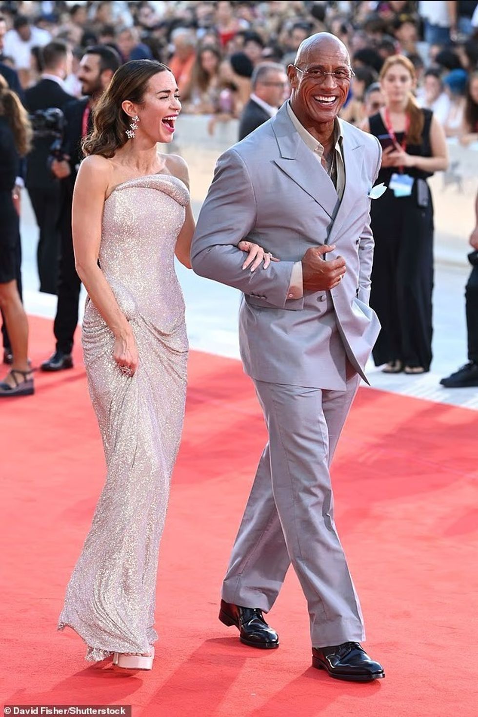 Në krah të saj ishte bashkë-ylli i filmit, Dwayne Johnson, i cili u shfaq i buzëqeshur dhe plot elegancë me një kostum gri.