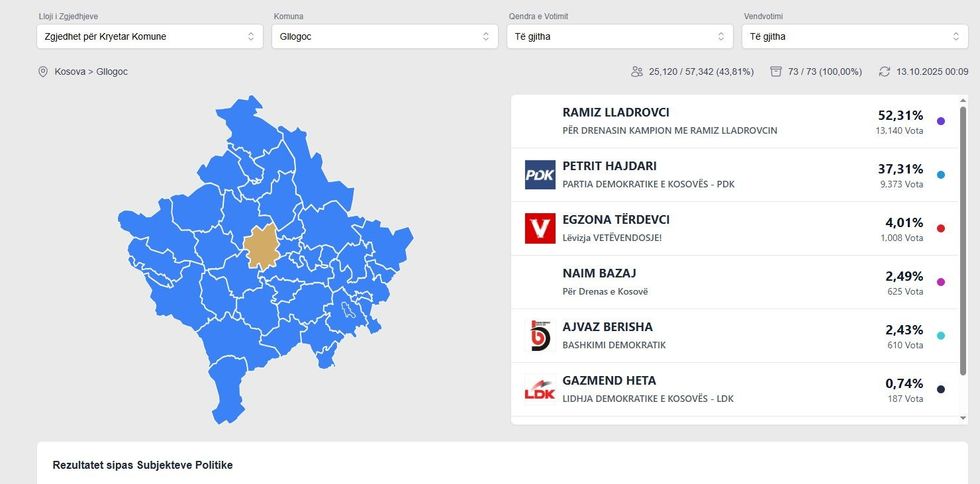 According to the latest data published at 00:14 on October 13, 2025, have been processed 25,120 votes out of total 57,342 registered.