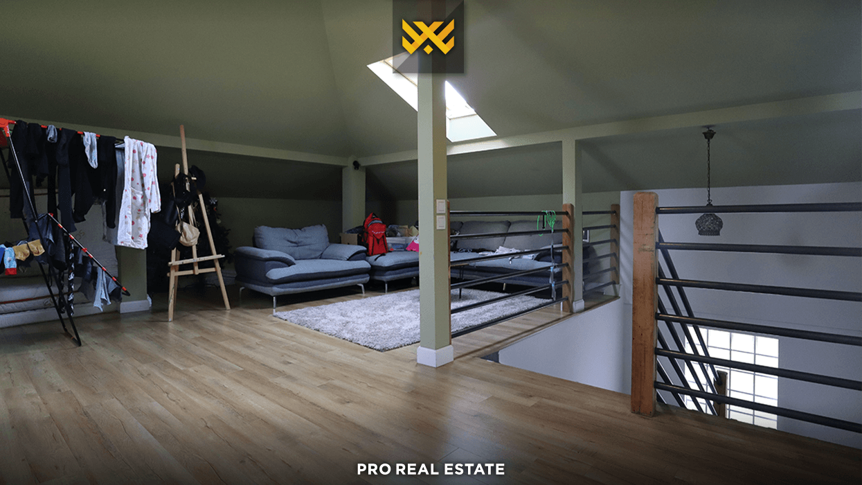 On the ground floor there is a living room with a kitchen and dining area, a bathroom, a utility room and a garage, while the first floor includes three bedrooms, two of them master bedrooms, a bathroom and two terraces. The attic offers two additional usable spaces.