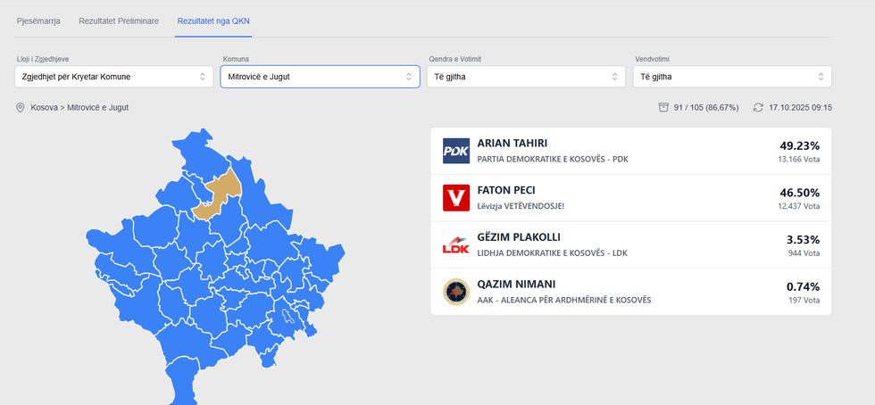 The Central Election Commission has updated today, October 17, the latest data, which show a very close race in Mitrovica, reports Telegrafi.