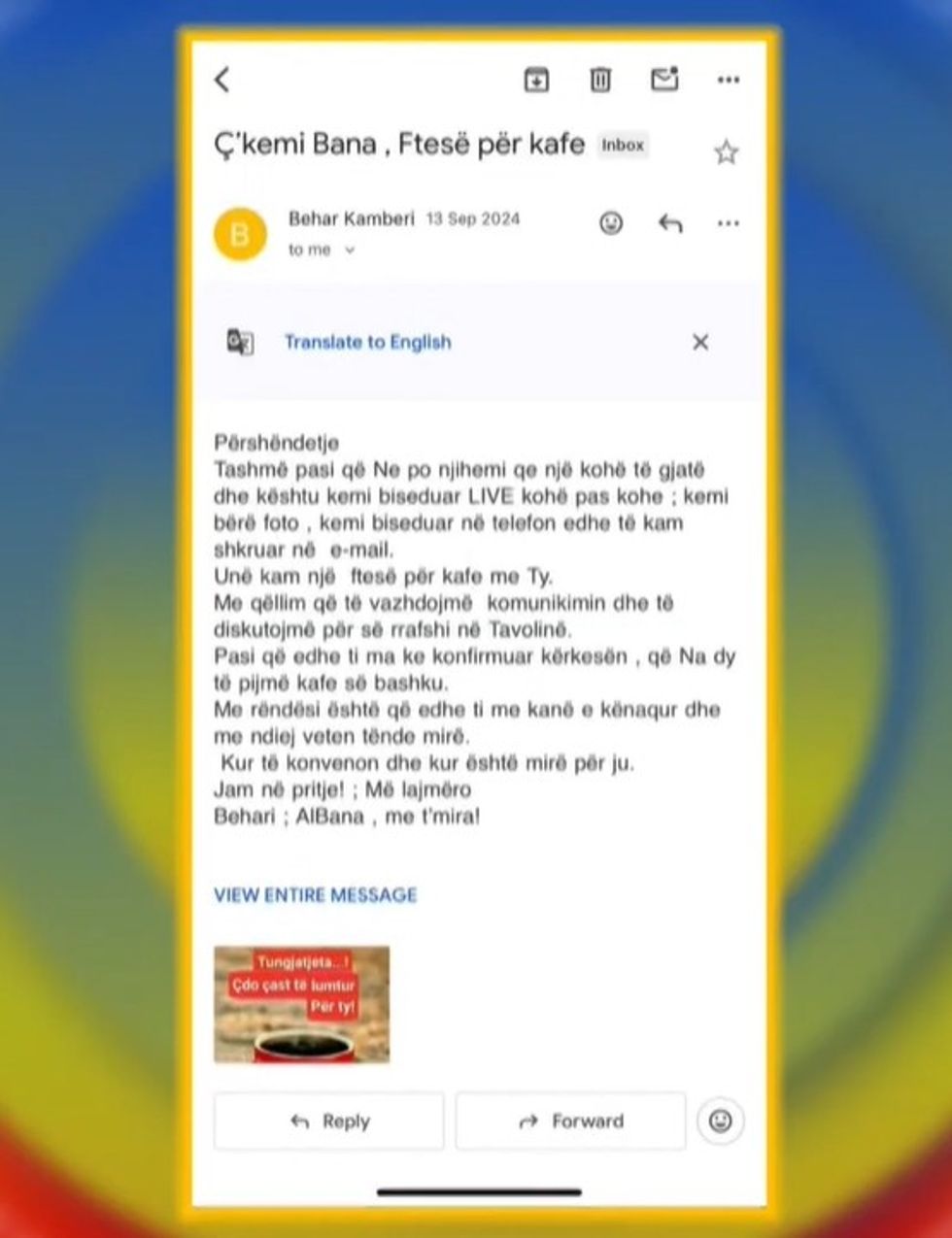 In one of the messages, Kamberi wrote: "Hello Albanian from Behar. I am the ideal man for you. I am an intellectual doctor, a gentleman, handsome and honest. I have a good financial situation and travel the world. But let's get married and live together in an apartment in Pristina, but also in Tirana. You will continue to work as you are now. I expect reflection from you."