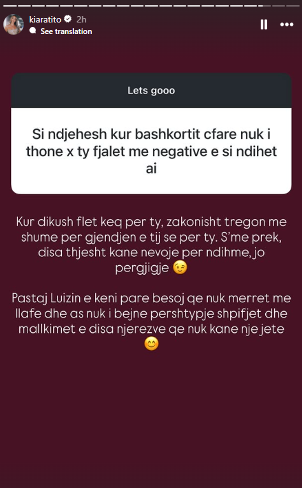 Albanian presenter and influencer, Kiara Tito, recently shared her thoughts with followers on Instagram, answering questions about how she and her husband deal with the negative comments and slander that often circulate on social networks.