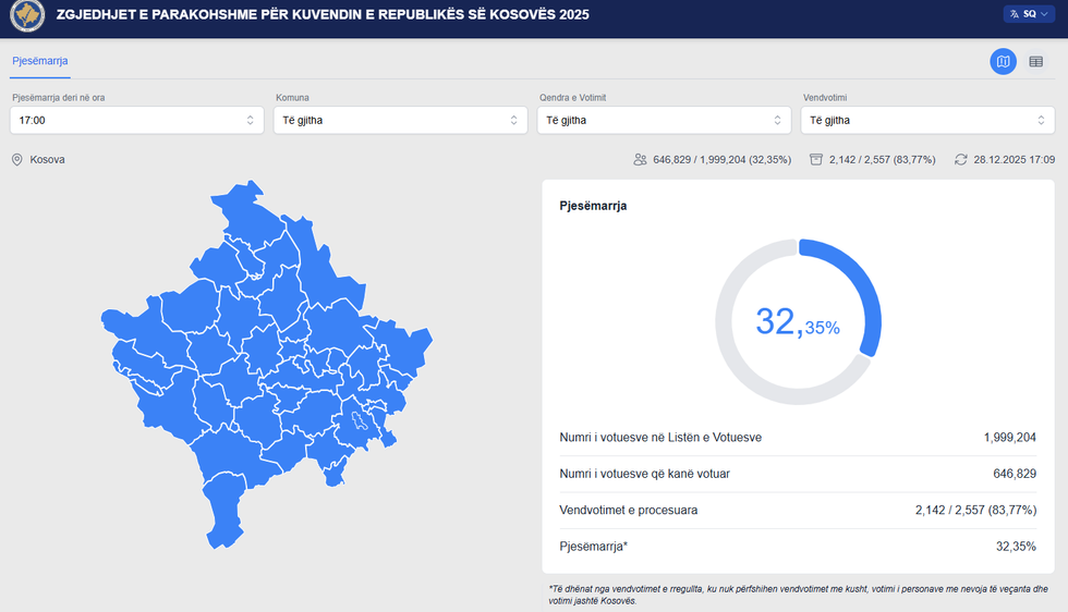 In the early elections for the Assembly of the Republic of Kosovo 2025, voter turnout as of 5:00 p.m. reached 32.35%. Out of a total of 1,999,204 voters registered on the voter list, 646,829 citizens participated.