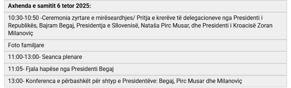 The summit will include a plenary session and a joint press conference between President Begaj and his counterparts from Slovenia, Nataša Pirc Musar, and Croatia, Zoran Milanović, who are also co-chairs of the Brdo-Brijuni Process. Bilateral meetings between the participating leaders are also planned.