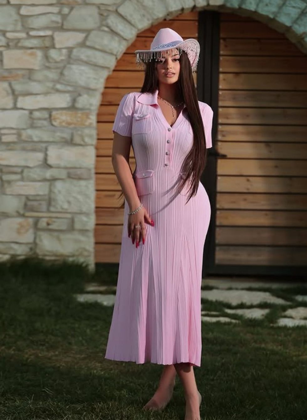E veshur me një fustan të gjatë rozë, me detaje të përpunuara në pjesën e përparme dhe prerje që theksojnë linjat trupore, Enca shkëlqeu në një set fotografik në ambient të hapur.