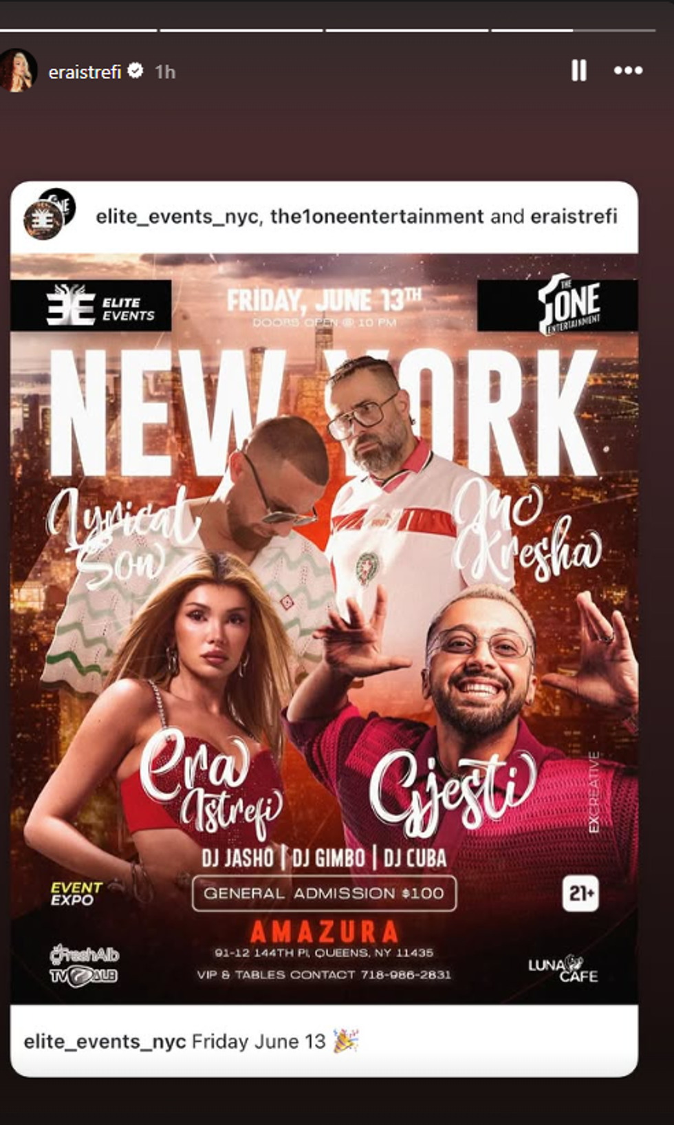Ndërsa nuk ka ndonjë bashkëpunim artistik të konfirmuar mes Erës dhe Gjesti-t, fakti që janë parë bashkë në New York dhe do të performojnë në të njëjtin event ka ngjallur kurreshtje te publiku dhe fansat e tyre. /Telegrafi/