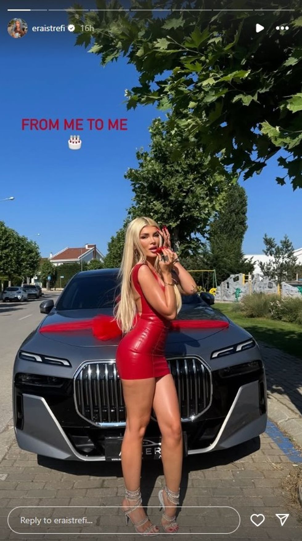 Në njërën prej fotografive, Era shfaqet para një veture BMW të zezë, e cila ishte dekoruar me një fjongo të madhe të kuqe, duke e zbuluar kështu dhuratën që ia ka bërë vetes me këtë rast të veçantë.