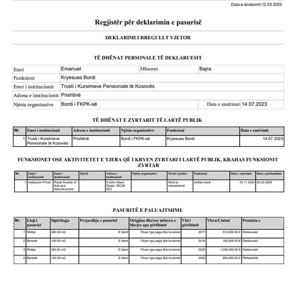 A është ndër zyrtarët më të pasur në vend - kjo është pasuria e Emanuel Bajrës, kryetar i Bordit të Trustit Pensional të Kosovës