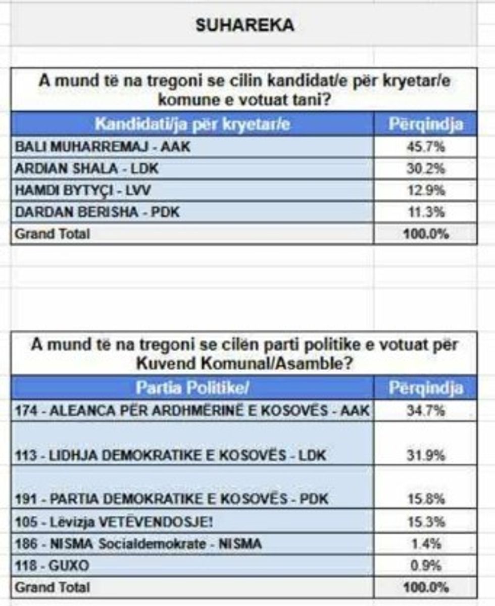Sipas EXIT POLL-it të realizuar nga RTV Dukagjini dhe kompania UBO-Consulting del që në Komunën e Suharekës do të ketë balotazh mes të Bali Muharremajt të AAK-së dhe Ardian Shalës së LDK.