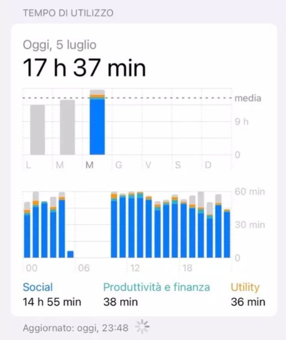 Ai publikoi një screenshot që tregonte një kohë ditore para telefonit prej plot 17 orë e 37 minuta, ku 15 orë i ka vetëm në rrjetet sociale.