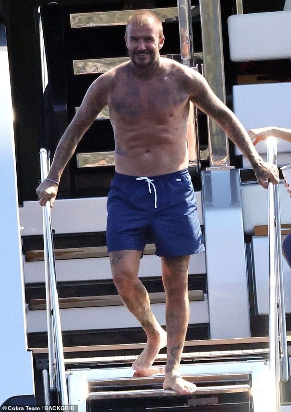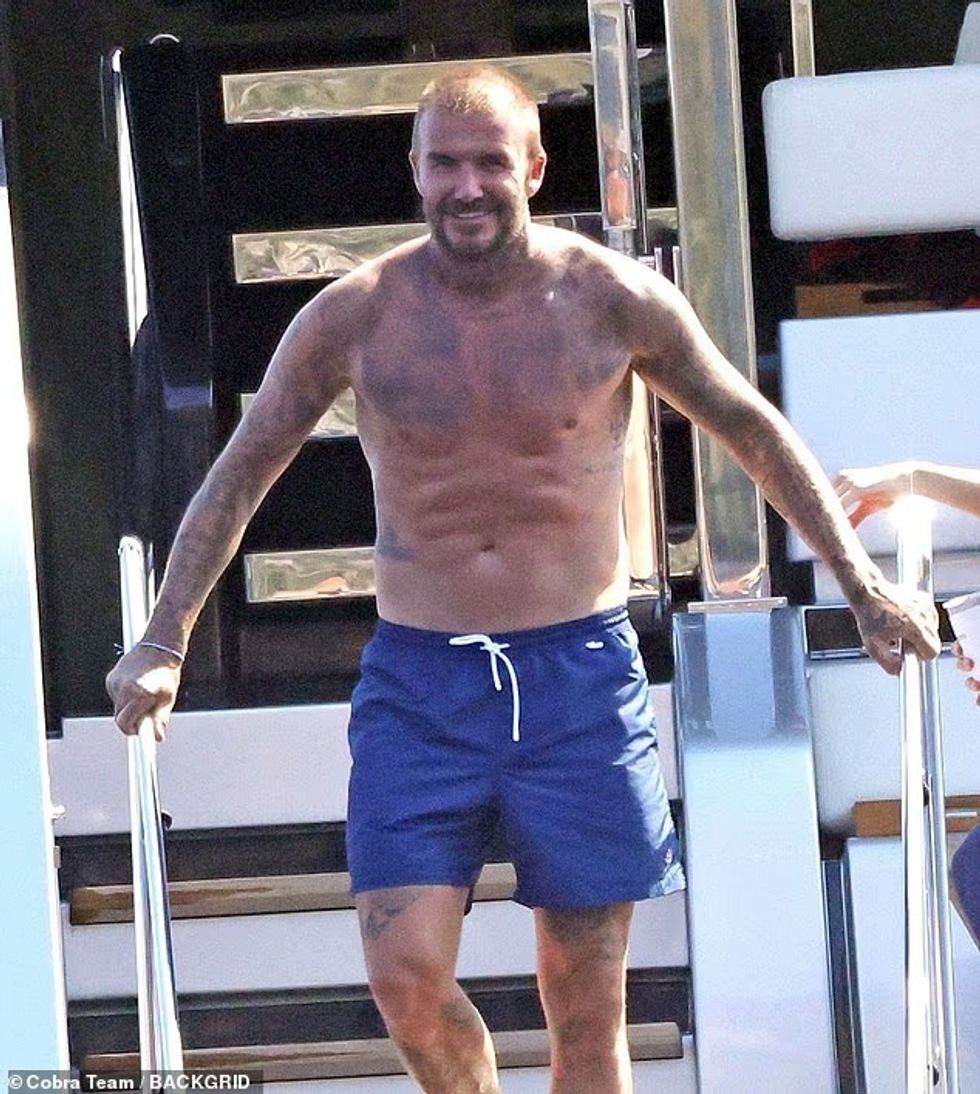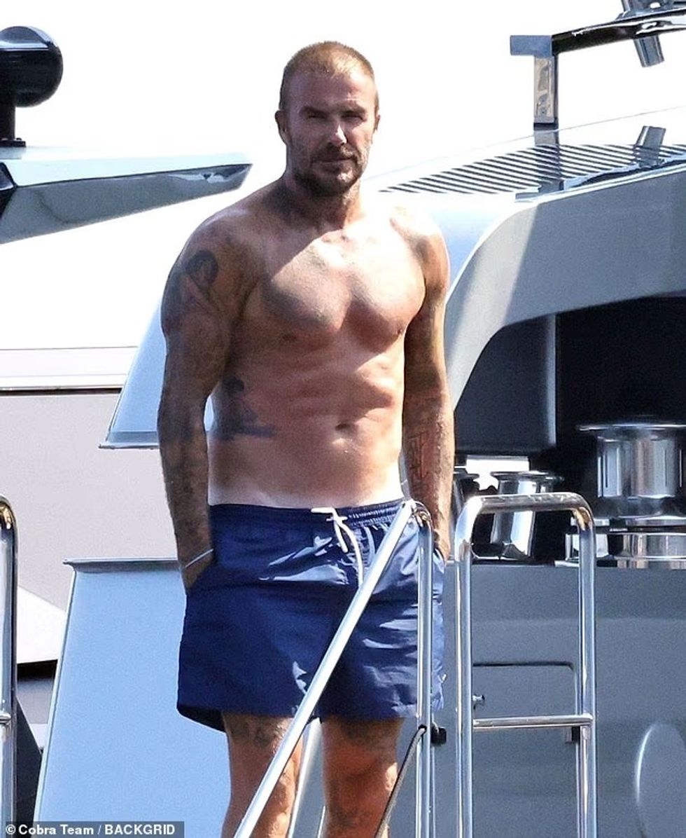 David dukej në formë të shkëlqyer, pa bluzë, duke treguar fizikun e tij muskulor dhe tatuazhet, ndërsa rrezitej me pantallona të shkurtra blu deti.