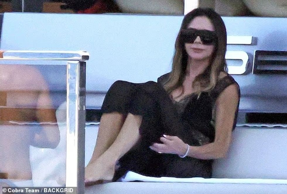 Victoria, nga ana tjetër, me syze dielli dhe një fustan elegant sateni të zi me detaje dantelle, shkëlqente mbi jaht.