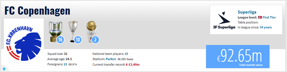 FC Copenhagen është klubi më i suksesshëm në Danimarkë, me 16 tituj kampioni dhe 10 Kupa të Danimarkës. Vlera aktuale e skuadrës së tyre arrin në rreth 92.6 milionë euro, çka tregon qartë diferencën në buxhet dhe përvojë.