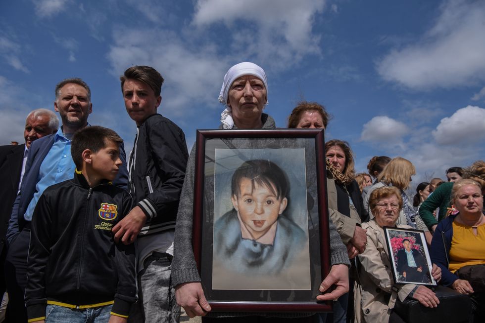 Sabrije Deliu, shqiptare e Kosovës, mban një pikturë që paraqet djalin e saj gjashtë-vjeçar, Bleart Deliun, i cili u vra në vitin 1999, gjatë një ceremonie më 5 prill 2017, që shënonte 18-vjetorin e masakrës në fshatin Rezallë, ku forcat serbe vranë 98 shqiptarë të Kosovës.