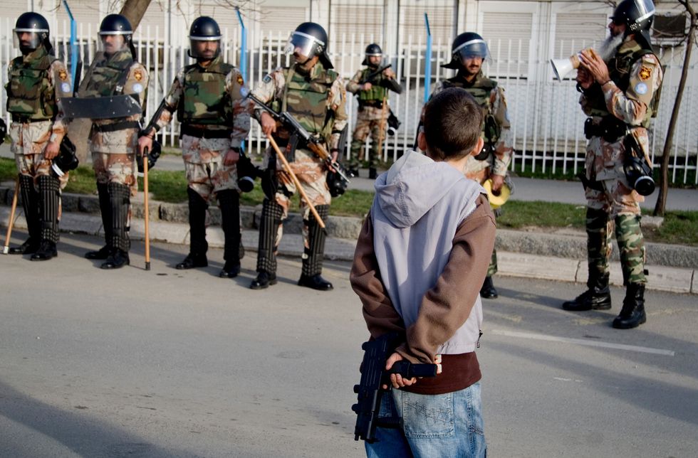 Një fëmijë mban një pushkë plastike teksa qëndron përballë policisë ushtarake të huaj në Prishtinë, më 27 shtator 2007.