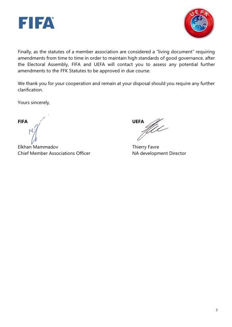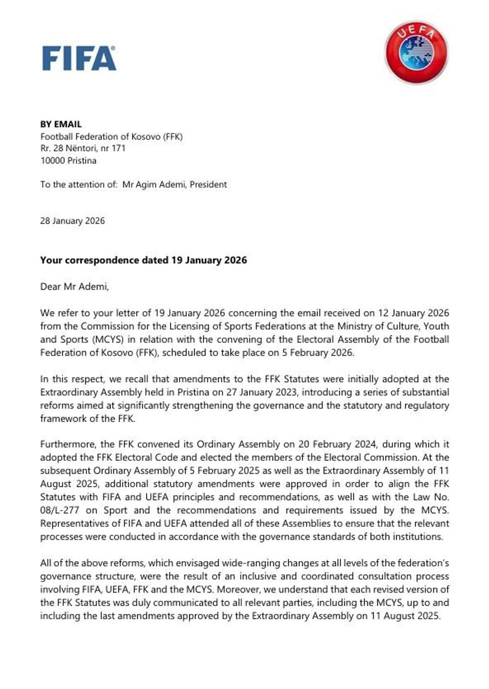 Në një shkresë të përbashkët drejtuar presidentit të FFK-së, Agim Ademi, dy institucionet ndërkombëtare vlerësojnë se amendamentet statutore janë rezultat i një procesi gjithëpërfshirës dhe të koordinuar konsultimi ndërmjet FIFA-s, UEFA-s, FFK-së dhe MKRS-së.