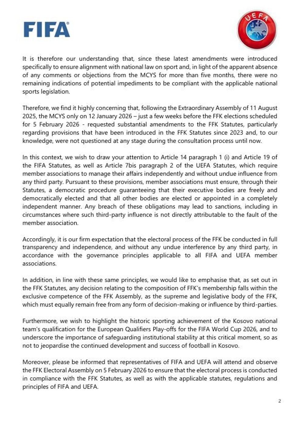Po ashtu, FIFA dhe UEFA kanë konfirmuar se përfaqësuesit e tyre do të jenë të pranishëm në Kuvendin Zgjedhor të FFK-së, i cili është planifikuar të mbahet më 5 shkurt 2026, për të vëzhguar zhvillimin e procesit në përputhje me Statutin e FFK-së.