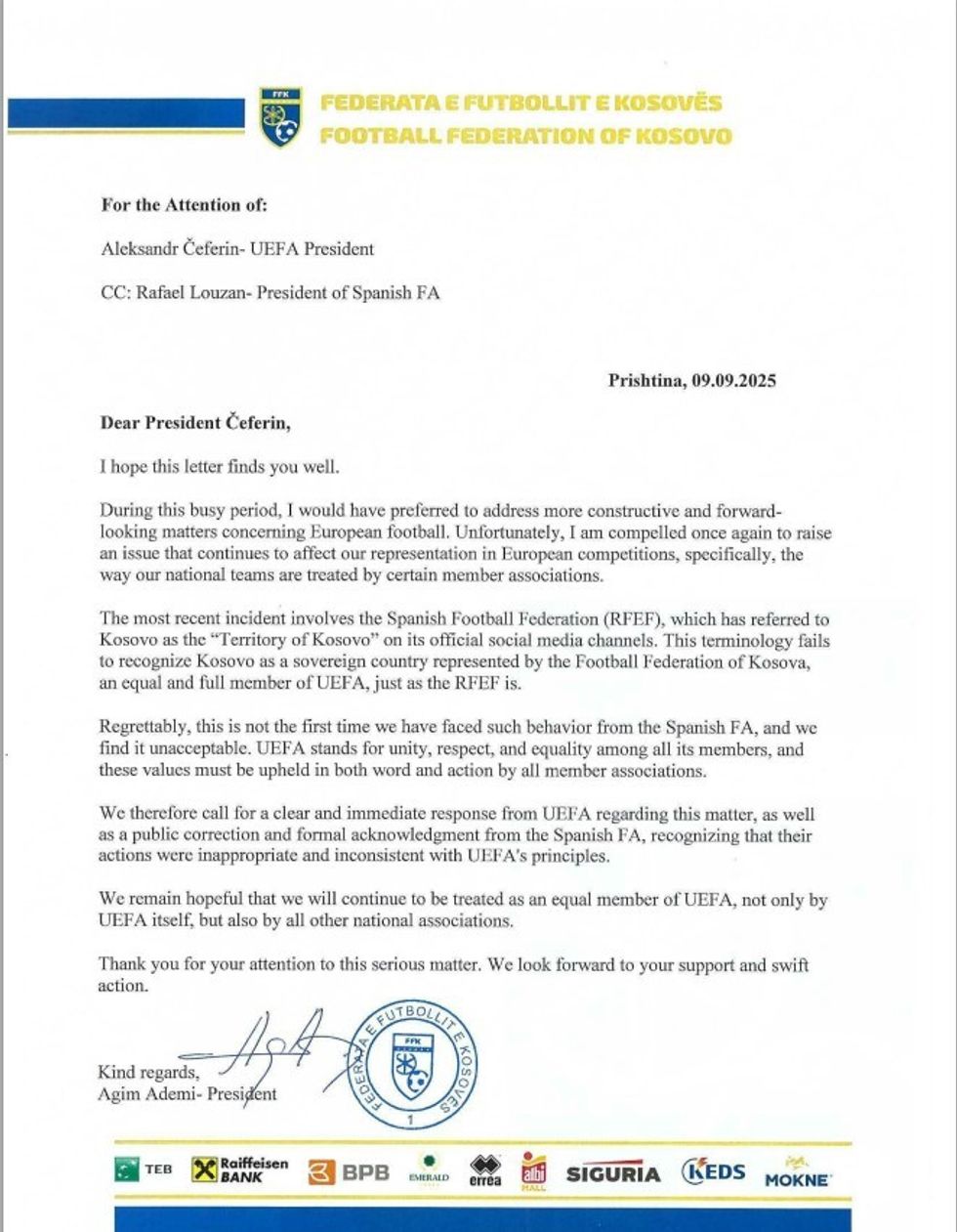 Federata e Futbollit e Kosovës përmes një shkrese nga presidenti Agim Ademi drejtuar presidentit të UEFA-s, Aleksandër Çeferin dhe presidentit të RFEF-së, Rafael Louzan ka paraqitur notë proteste ndaj veprimit të papranueshëm të Federatës Spanjolle të Futbollit, e cila në komunikimet e saj zyrtare në prag të ndeshjes kualifikuese për Evropianin 2027, Kosovë-Spanjë, iu referua Kosovës si “territori i Kosovës”.