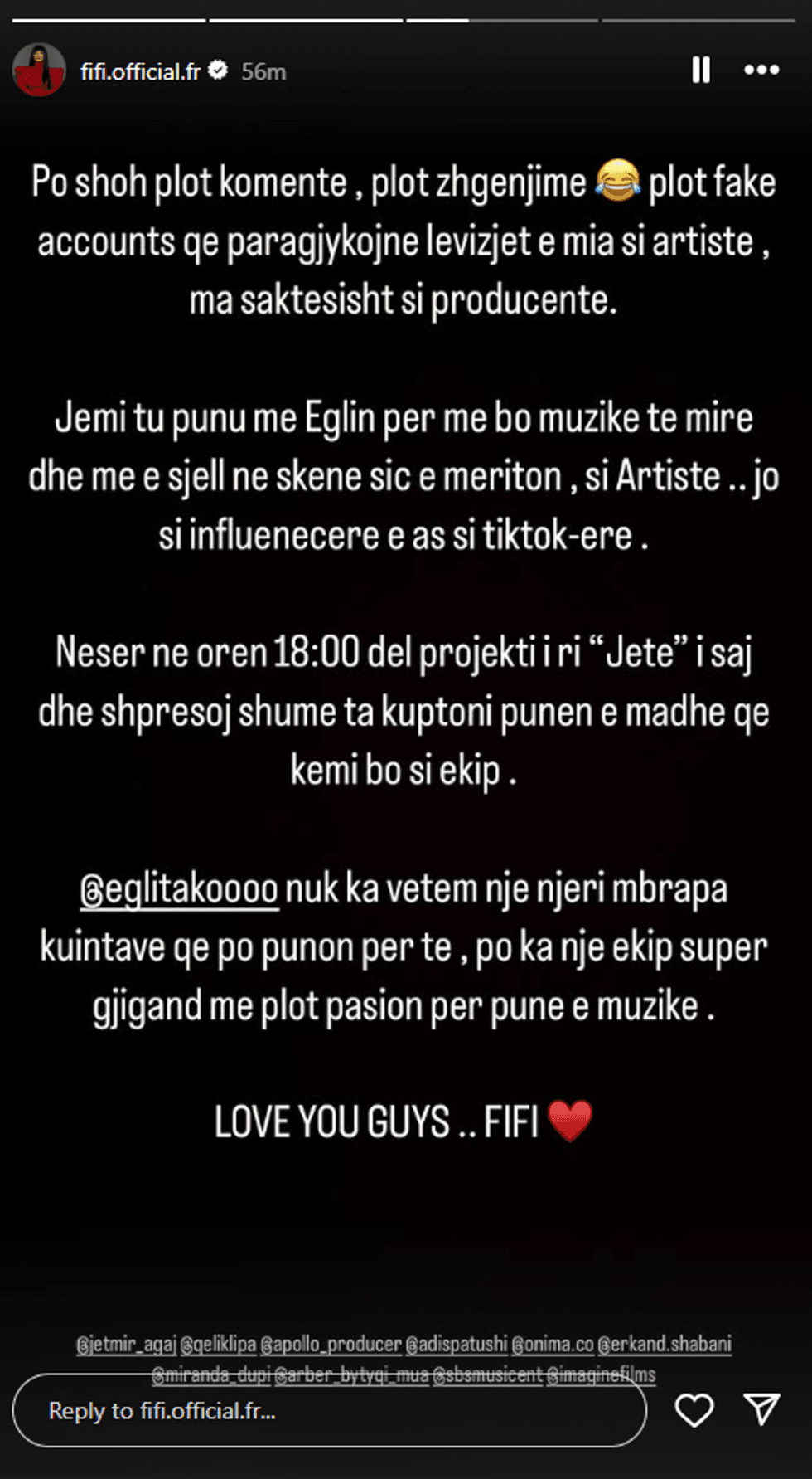 Jemi duke punuar me Eglin që të bëjmë muzikë të mirë dhe me e sjell në skenë siç e meriton, si artiste...jo si influencere e as si TikTok-ere.