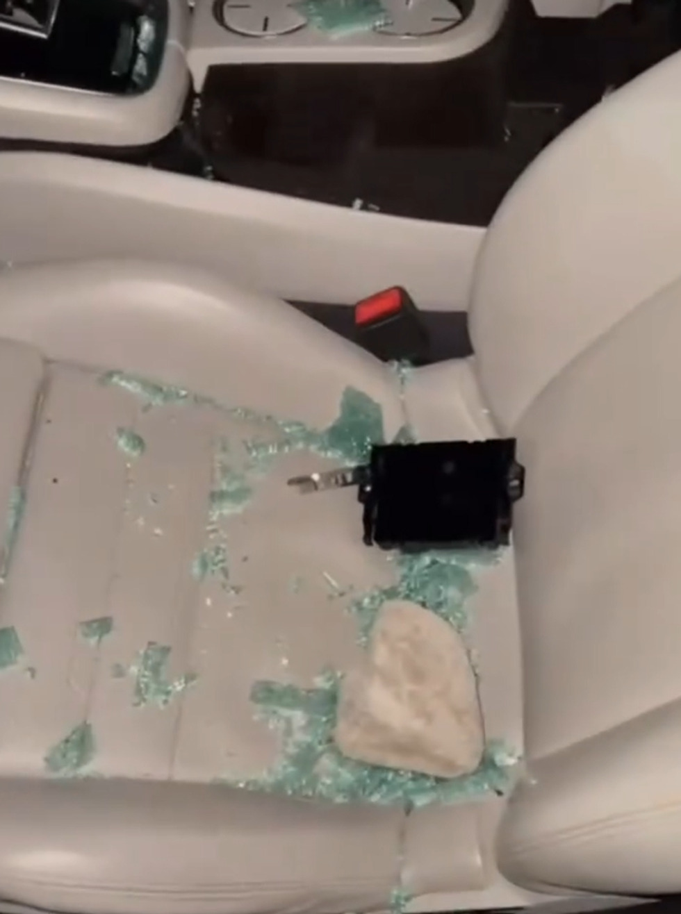 Ajo ka publikuar pamjet në InstaStory, teksa shihet se ia kanë thyer njërin xham të makinës që ka.