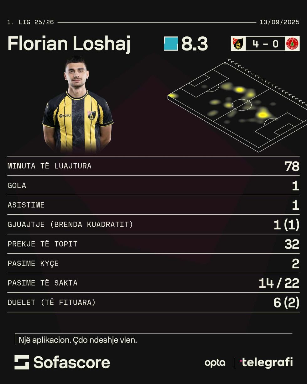 Në këtë ndeshje, Loshaj kishte 32 prekje të topit, dy pasime kyçe si dhe 14 nga 22 pasime të sakta. Sofascore ndër të tjera e vlerësoi me notën 8.3.