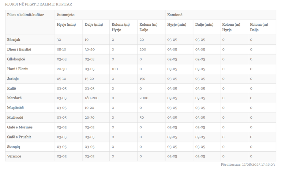 Sipas të dhënave të përditësuara më 17 gusht 2025 në orën 17:46, pritjet më të gjata për automjete janë regjistruar në pikën kufitare të Merdarës, ku koha e pritjes në dalje është 180 deri në 200 minuta, ndërsa kolona arrin deri në 2000 metra.