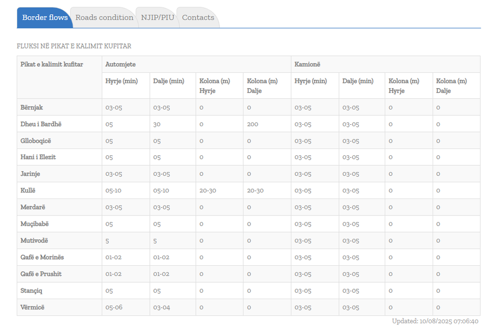Të gjitha pikat e tjera kufitare, përfshirë Merdarën, Vërmicën, Jarinjen, Glloboqicën, dhe Hanin e Elezit, raportohen me fluks normal, me pritje të shkurtë prej 3 deri në 5 minuta, pa kolona të automjeteve apo kamionëve.