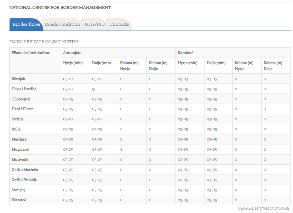 Sipas të dhënave të fundit të përditësuara në orën 07:43 nga Qendra Kombëtare për Menaxhim Kufitar, në shumicën e pikave të kalimit kufitar pritjet për automjete dhe kamionë janë brenda intervalit 3 deri në 10 minuta dhe nuk ka kolona të raportuara.