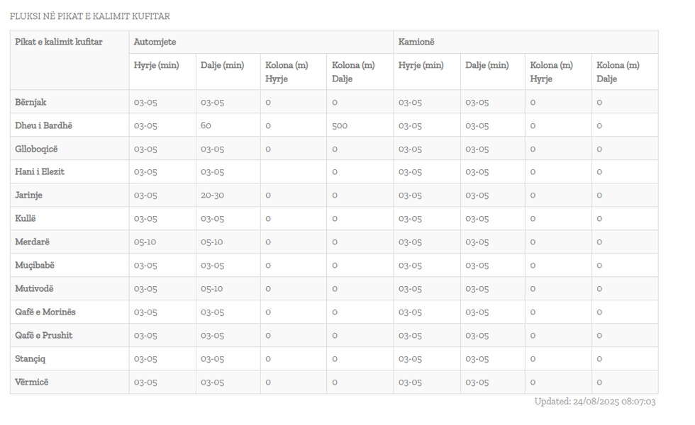 Në këtë pikë kufitare regjistrohet edhe kolona prej 500 metrash në dalje për automjetet. Në të gjitha pikat e tjera kolonat në hyrje dhe dalje janë zero.