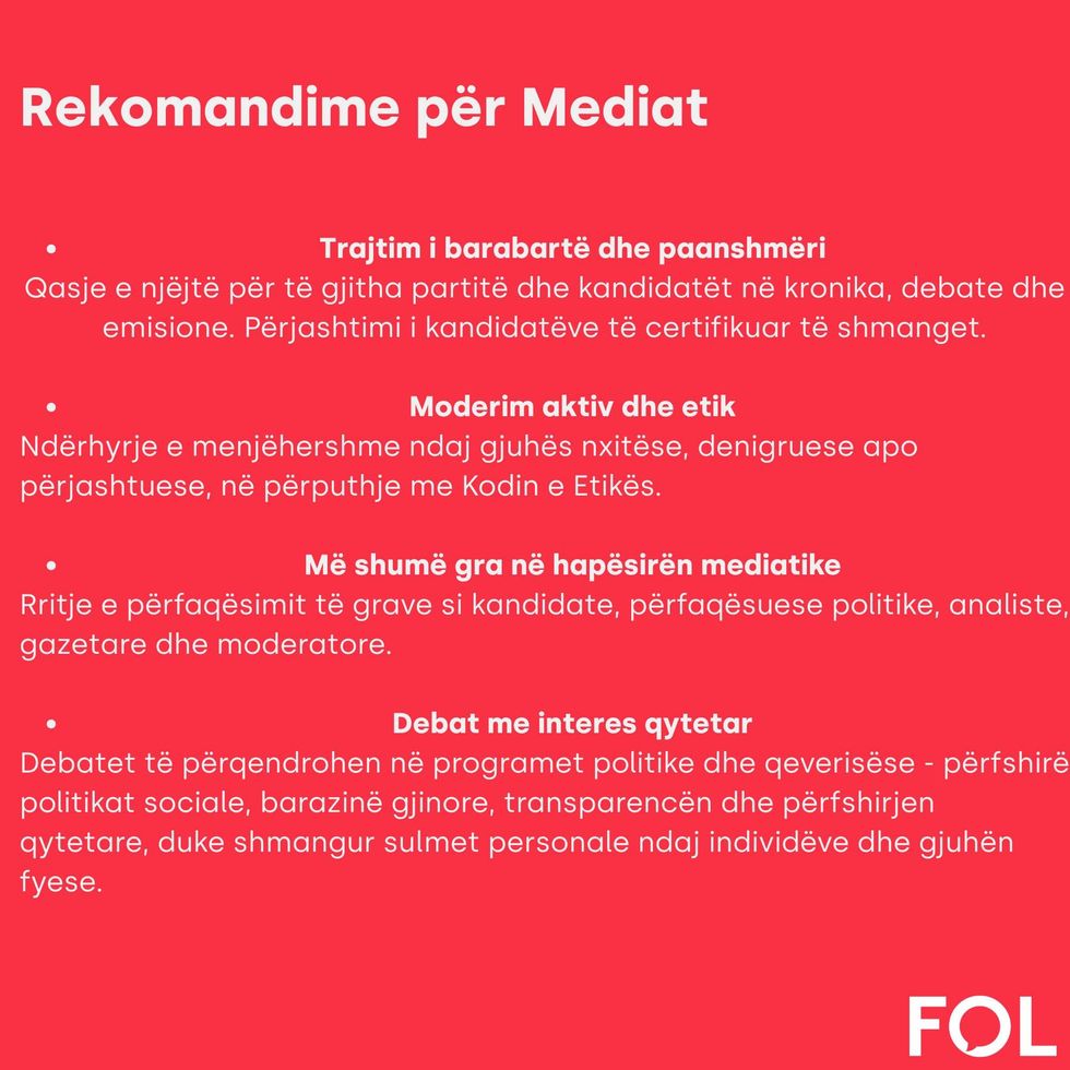 Lëvizja Fol thekson tutje se rekomandimet synojnë të jenë një kontribut informues në prag të Zgjedhjeve të Përgjithshme të dhjetorit 2025, në funksion të forcimit të përgjegjësisë politike dhe mediatike ndaj qytetarëve. /Telegrafi/