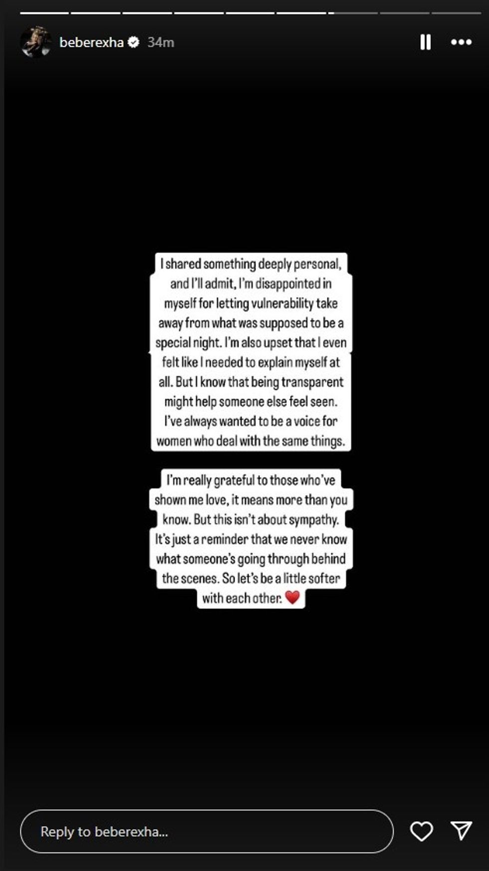 Pavarësisht gjithë dhimbjes, presionit dhe kritikave, Bebe mbetet e palëkundur në misionin e saj për të qenë një zë i fortë për gratë që përballen me sfida të ngjashme. “Nuk bëhet fjalë për keqardhje, por për mirëkuptim. Të jemi më të butë me njëri-tjetrin”, përfundoi ajo. /Telegrafi/