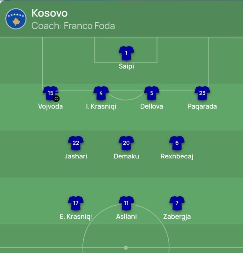 Kosova: Saipi, Vojhvoda, I. Krasniqi, Dellova, Paqarada, Jashari, Rexhbeçaj, Demaku, Zaberxha, Asllani, E. Krasnqi.