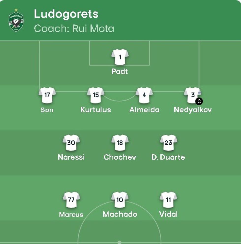 Ludogorets: S. Padt, Son, E. Kurtulus, D. Almeida, A. Nedyalkov, Pedro Naressi, D. Duarte, I. Chochev, Erick Marcus, M. Machado dhe C. Vidal