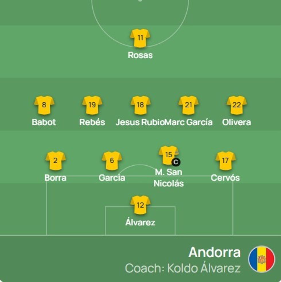 Andorrë: Alvarez, Borra, Garcia, San Nicolas, Cervos, Babot, Rebes, Jesus Rubio, Garcia, Olivera, Rosas.