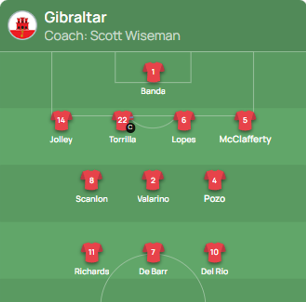 Gjibraltari: Banda, Jolley, Torilla, Lopes, McClafferty, Scanlon, Valarino, Pozo, Richards, De Barr, Del Rio.