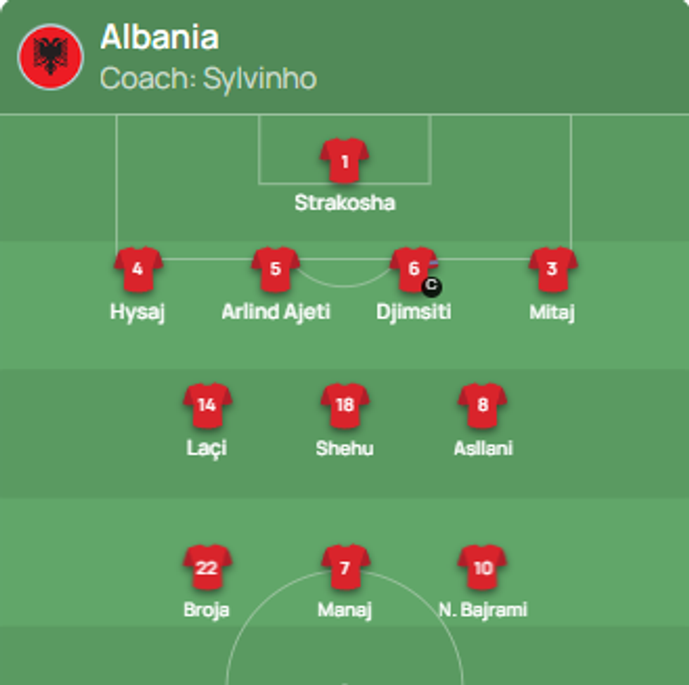 Përzgjedhësi i Shqipërisë, Sylvinho ka zgjedhur një formacion ofensiv, duke dhënë sinjal të qartë se ekipi do të synojë tre pikët. Në sulm do të aktivizohen Armando Broja, Rey Manaj dhe Nedim Bajrami, tre lojtarë që kanë aftësinë të krijojnë rrezik për portën kundërshtare dhe të shfrytëzojnë çdo mundësi.