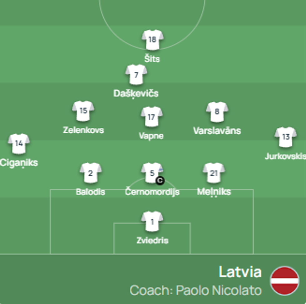 LETONIA: Zviedris, Jurkovskis, Melniks, Çernomordijs, Balodis, Ciganiks, Varslavans, Vapne, Zelenkovs, Daskevics, Sits.