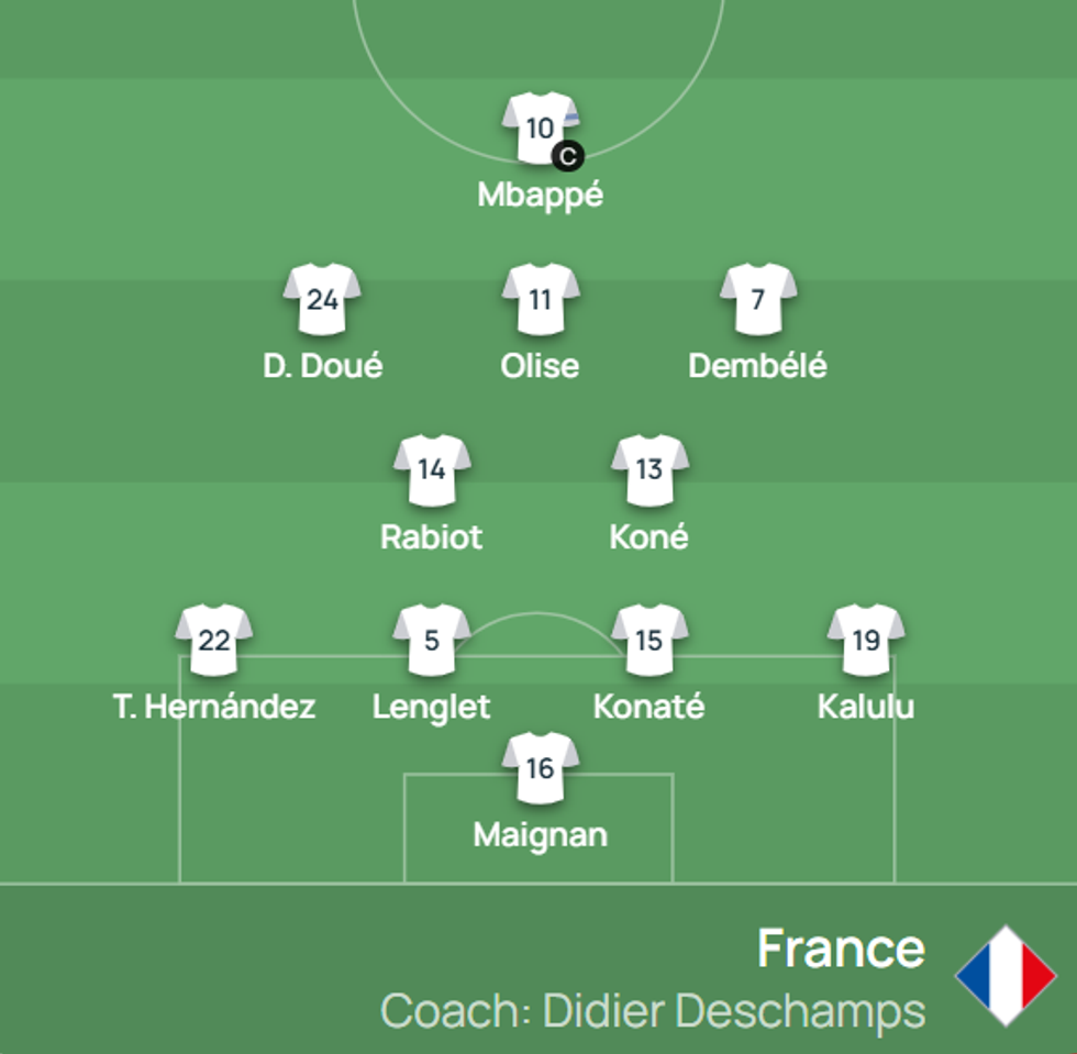 Maignan; Kalulu, Konaté, Lenglet, Theo Hernández; Doué, Rabiot, Koné; Olise, Dembele, Mbappe.