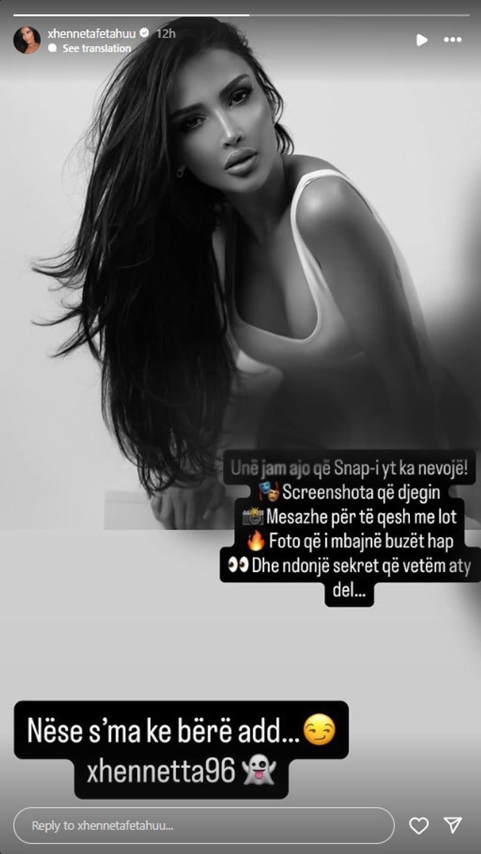 Modelja sugjeron se përmbajtja në Snapchat është më e veçantë dhe më personale, duke shtuar: “Nëse s’ma ke bërë add… xhennetta96”.