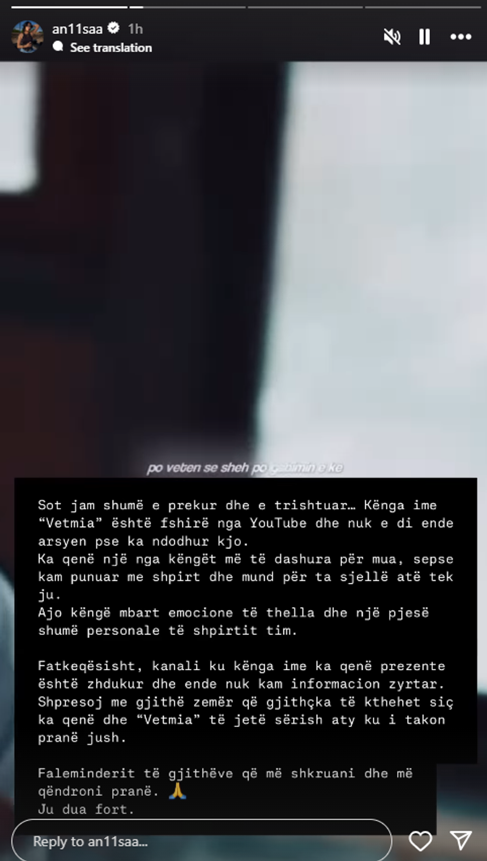 “Sot jam shumë e prekur dhe e trishtuar… Kënga ime ‘Vetmia’ është fshirë nga YouTube dhe nuk e di ende arsyen pse ka ndodhur kjo. Ka qenë një nga këngët më të dashura për mua, sepse kam punuar me shpirt dhe mund për ta sjellë atë tek ju”, shkruan ajo.