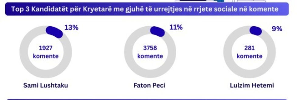 “Në nivel të kandidatëve për kryetarë komunash, më së shumti gjuhë urrejtjeje është adresuar ndaj Faton Pecit me 3,758 komente (11%), Sami Lushtakut me 1,927 komente (13%), dhe Lulzim Hetemit me 281 komente (9%). Këto shifra nxjerrin në pah sfidat e kandidatëve për t’u përballur me gjuhë nxitëse dhe përçarëse gjatë fushatës, sidomos në hapësirat digjitale”, thuhet në njoftim.