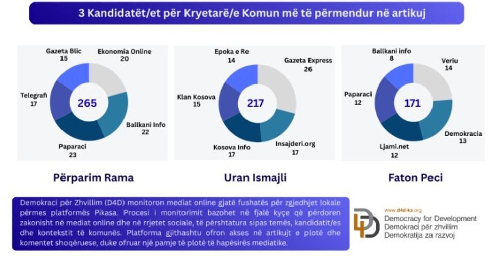 Sa i përket përmendjes së kandidatëve në artikujt e mediave online, Përparim Rama prin me 265 artikuj, i pasuar nga Uran Ismajli me 217 dhe Faton Peci me 171.