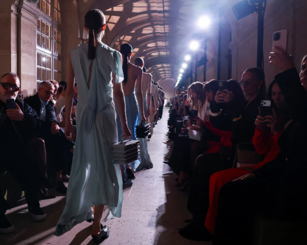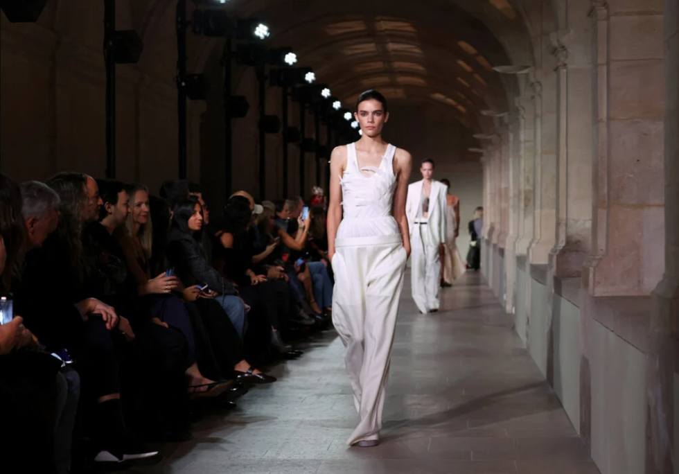 Modelet ecnin nën harqe të veshura me këpucë me majë të mprehtë, ndërsa prerjet e fustaneve luanin me asimetri dhe tekstura - pëlhurat ishin të rrudhura në disa vende ose dukeshin sikur të ishin të mbuluara me pluhur.