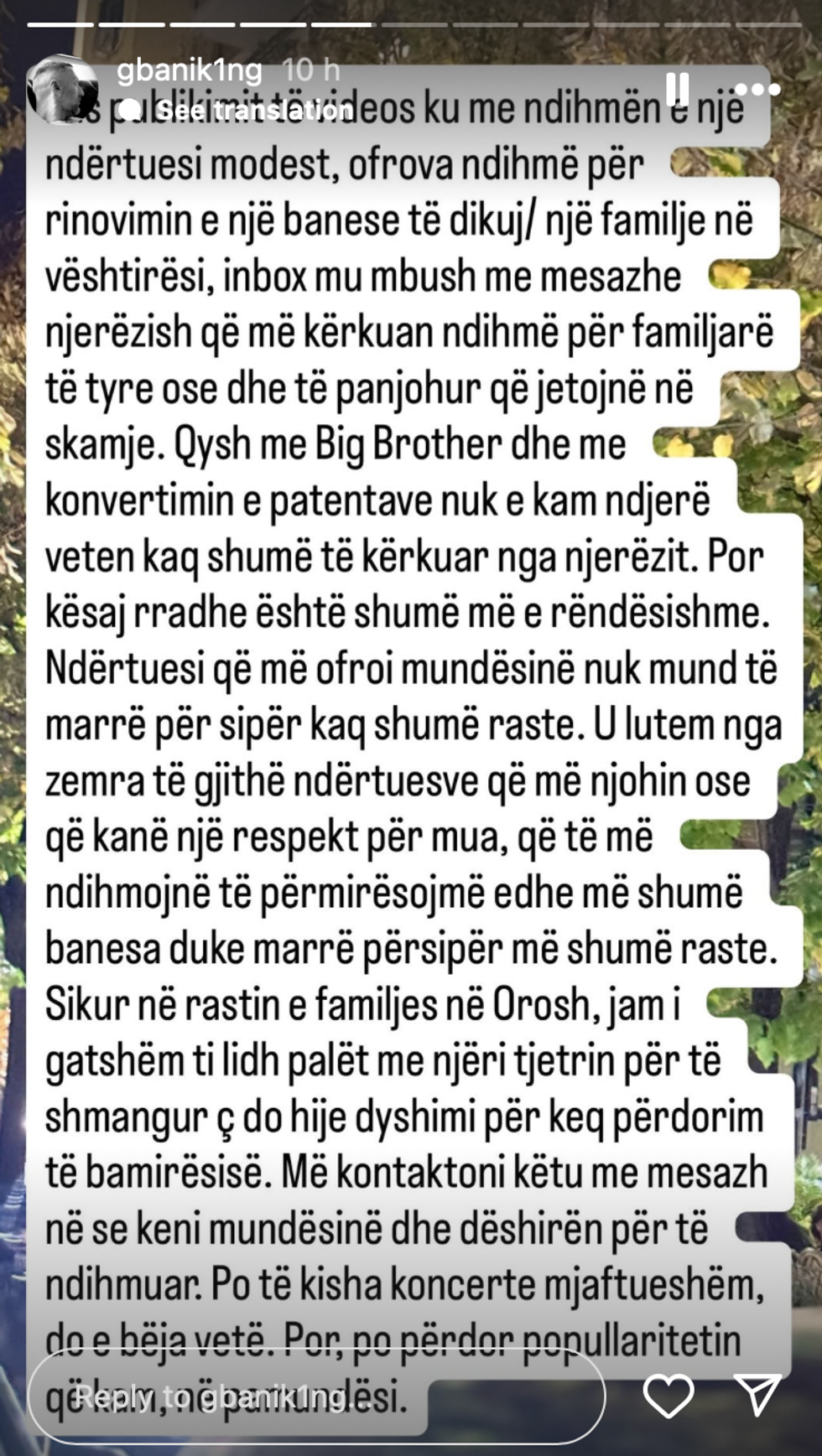 Pas publikimit të videos, G-Bani ka treguar se është përmbytur nga mesazhe në “inbox”, me njerëz që kërkojnë ndihmë për familjarë apo për persona të tjerë në nevojë. “Nuk e kam ndjerë kurrë më shumë se tani se sa shumë njerëz kanë nevojë për mbështetje,” ka shkruar ai.