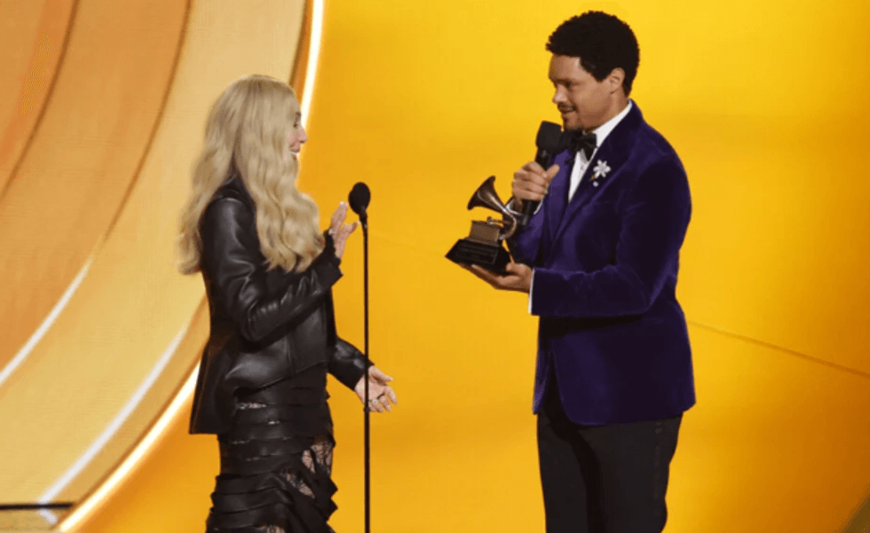 Prezantuesi i natës, Trevor Noah, e ndaloi me humor dhe e nxiti të kthehej, duke shkaktuar të qeshura tek publiku.